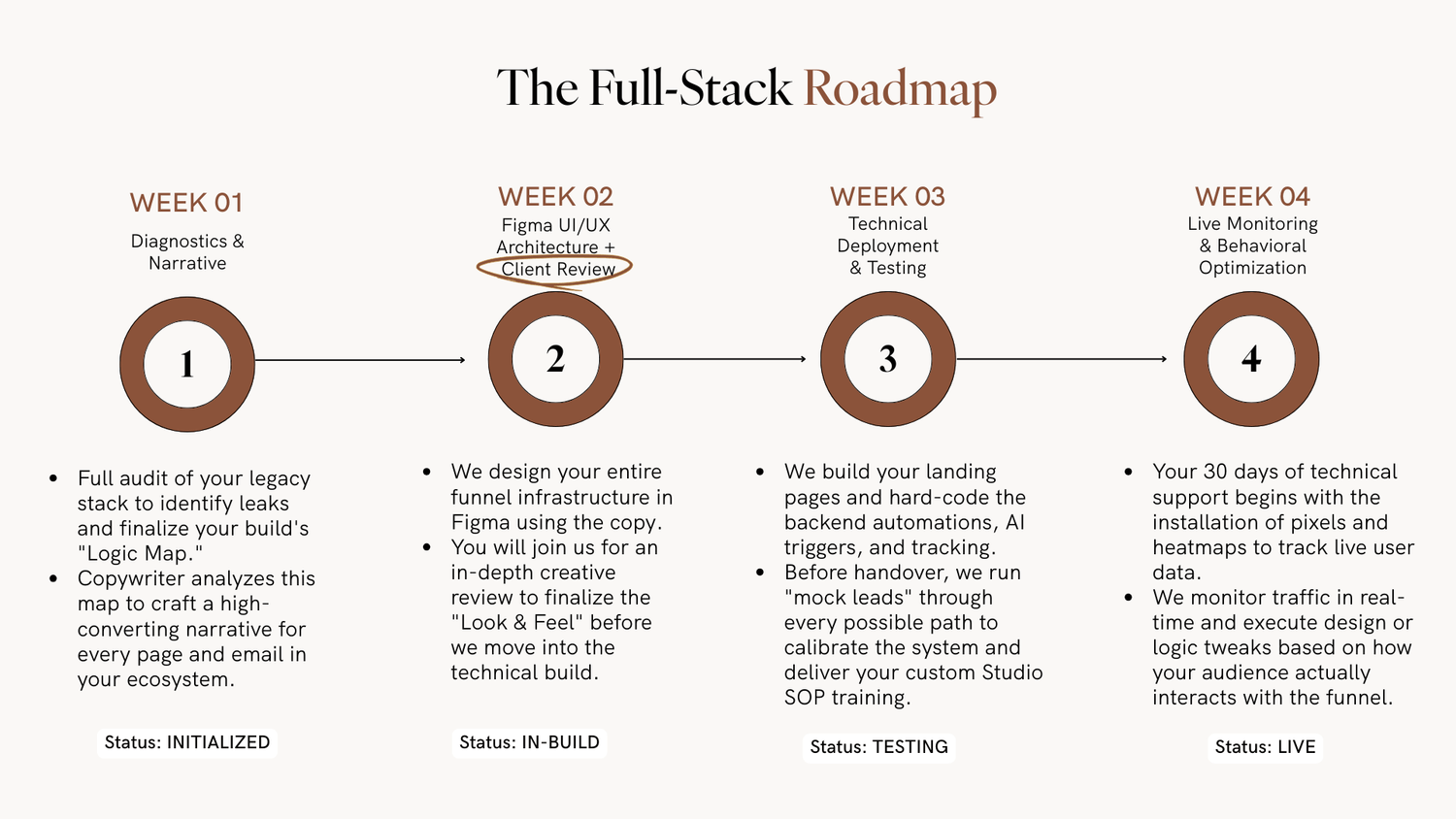 Before a single automation is built or a line of copy is written, we open the "hood" of your business. Most funnels fail because they are built on fragmented logic and hence we start with a Full Infrastructure Audit.